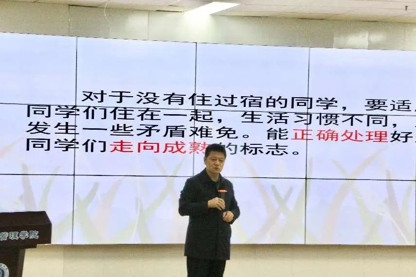 之后,肖书记特意提到安全与人际交往方面。强调宿舍没人时一定要断电,坚决不得使用违禁危险物品,排好值日表,定期打扫卫生,创造良好的宿舍生活。肖书记还指出,在宿舍中,来自五湖四海的同学们生活在一起,生活习惯不同,发生矛盾在所难免,当我们能正确处理好这些矛盾时,就是同学们走向成熟的标志。