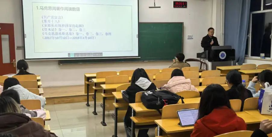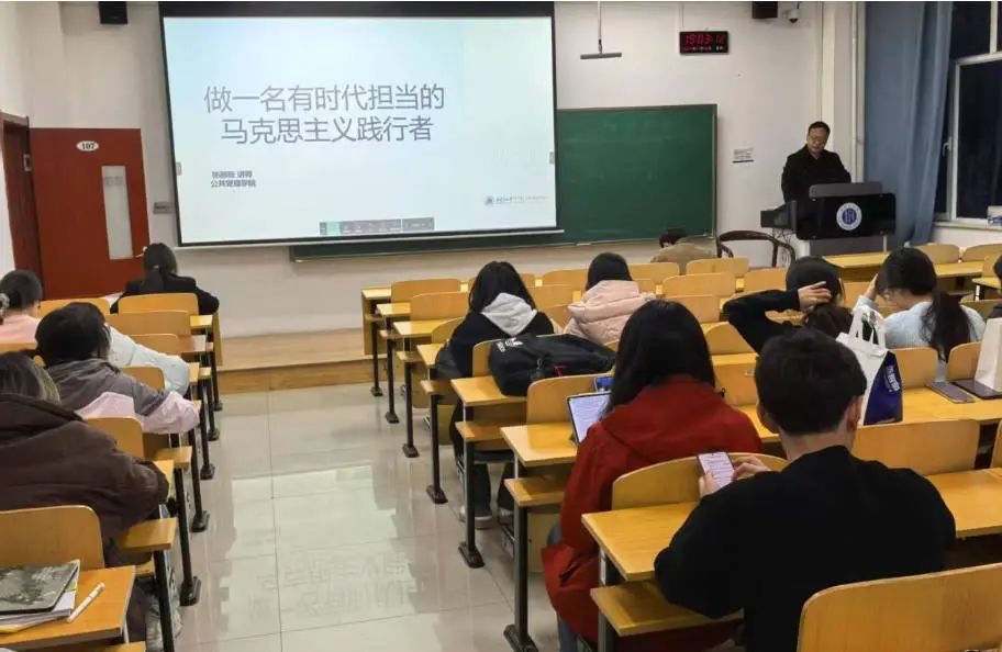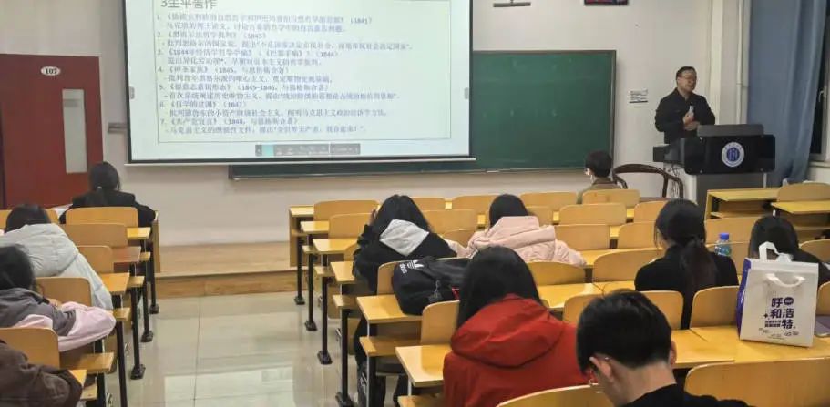 在《做一个有时代担当的马克思主义践行者》讲座现场,杨丽新老师凭借扎实的专业知识,拉开了马克思主义理论的精彩帷幕。杨老师不仅详细阐释了马克思主义哲学、政治经济学和科学社会主义的核心要义,还结合现实案例,深入浅出地分析理论在实际生活中的应用。同时,杨老师简述了马克思跌宕起伏的一生,从青年马克思怀揣理想,批判旧制度,到流亡时期,在艰苦环境中撰写《资本论》。