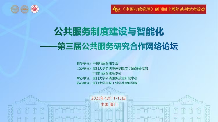为深入学习和贯彻党的二十大和二十届三中全会精神,4月12日,在中国行政管理学会的指导下,由厦门大学公共事务学院、公共政策研究院会同《中国行政管理》杂志社携手举办的“第三届公共服务研究合作网络论坛”在厦门大学召开。来自中国行政管理学会、清华大学、中国人民大学、上海交通大学、复旦大学、tyc5997太阳集团的60余位专家学者及近100名师生代表参会。会议得到《管理世界》《中国行政管理》《行政论坛》《厦门大学学报(哲社版)》等多家期刊支持。