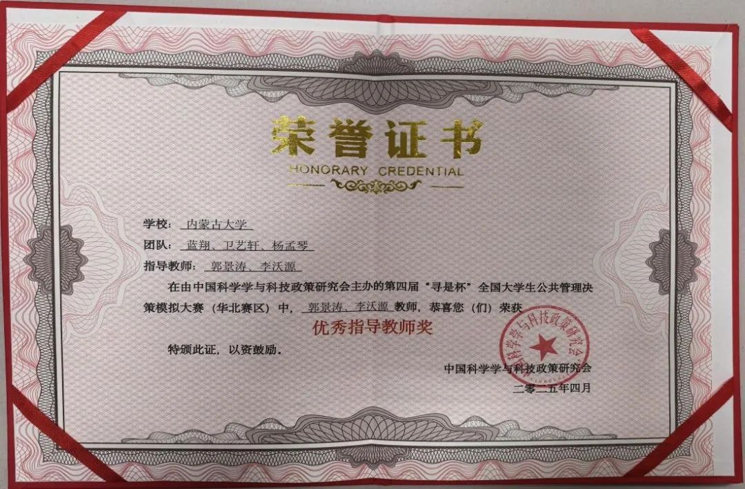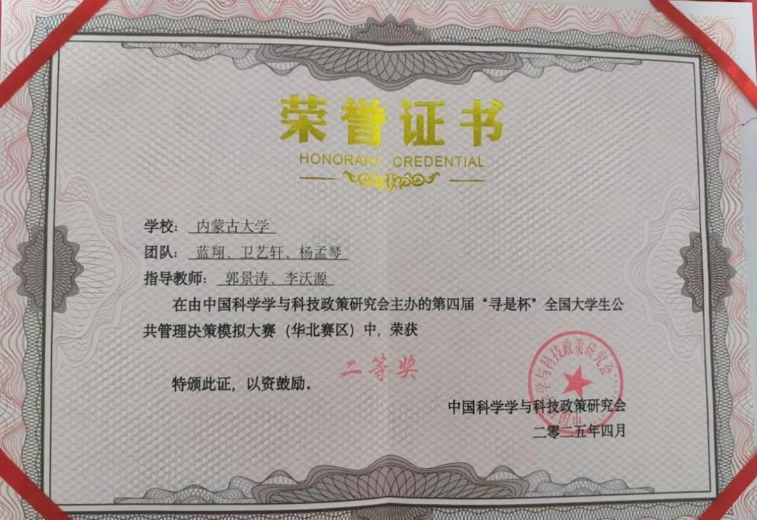 2025年4月25-26日,我院“蒙得都队”(指导教师:郭景涛、李沃源;参赛同学:蓝翔、卫艺轩、杨孟琴)在教育部高等学校公共管理类专业教学指导委员会指导举办的第四届“寻是杯”全国大学生公共管理决策模拟大赛中获得“二等奖”,指导教师郭景涛、李沃源获“优秀指导教师奖”。