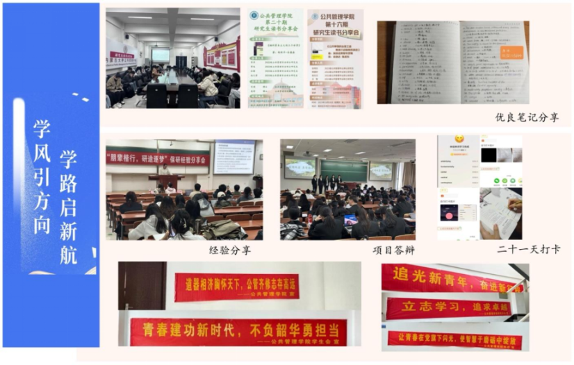 学院重视营造良好学习氛围,建设优良学习环境,依托“一站式”学生社区,积极开展各项学风建设活动,如21天自习打卡、优良学习笔记风采展、读书分享会、本科生学术创新训练营活动、考研—考公—求职经验交流分享会等。通过学风建设系列活动,引导师生共同营造浓厚的学习氛围,塑造学生良好的学习行为习惯。此外,还组织丰富多彩的校园文体活动,为学生搭建交流沟通和风采展示的平台。同时还利用课余时间,组织学生进入社区开展志愿活动,利用假期开展暑期“三下乡”社会实践、返家乡、扬帆计划等实习实践活动,引导学生深入基层、扎根基层,将理论与实践有机融合。