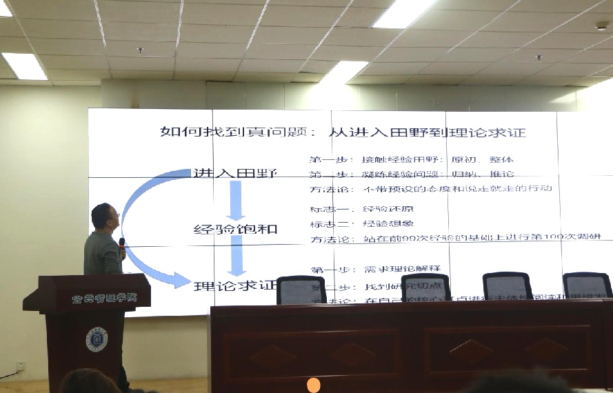 随后,杨丽新老师结合自身发表《项目控制权分配与农村公共品供给的实践差异》一文的创作经历,分享了从田野调查到论文成稿的全流程心得。他从最初关注的社会现象出发,以经验有惑、文献求解、理论构建和实践论证为主要路径,分析了撰写选题逻辑构建、文献系统梳理、学术表述优化等多个关键知识点,细致拆解了从“问题萌芽”到“成果输出”的完整学术研究路径。