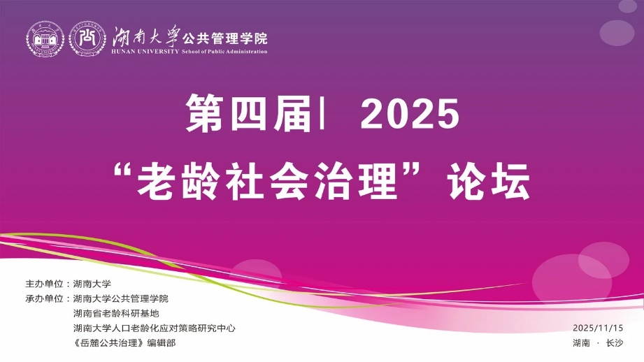 2025年11月15日,第四届“老龄社会治理”论坛在长沙举行。本次论坛由湖南大学主办,湖南大学太阳集团tyc5997、湖南省老龄科研基地、湖南大学人口老龄化应对策略研究中心及《岳麓公共治理》编辑部联合承办。论坛围绕老龄社会治理的前沿议题展开深度研讨与交流,并设“老龄社会治理与社会保障体系”“养老金融与银发经济”“养老服务与社会支持体系”“老龄健康与老年友好环境建设”及“老龄社会其他议题”五个分论坛。我院白维军院长应邀作主题报告演讲,博士研究生王邹恒瑞投稿参会并在第三分论坛作学术汇报。