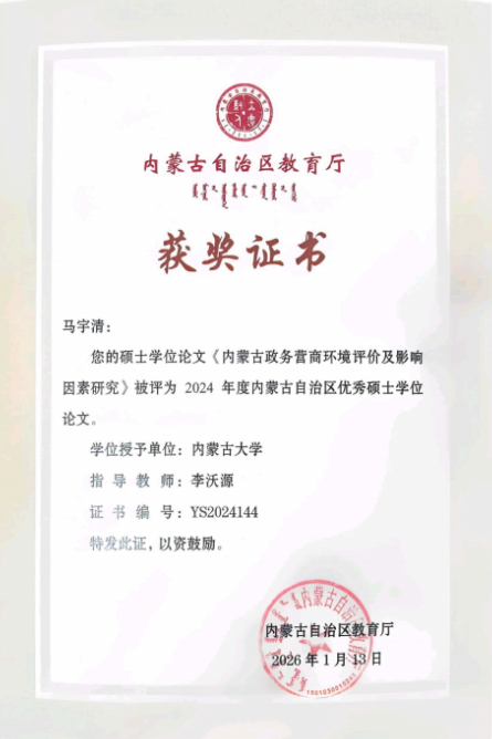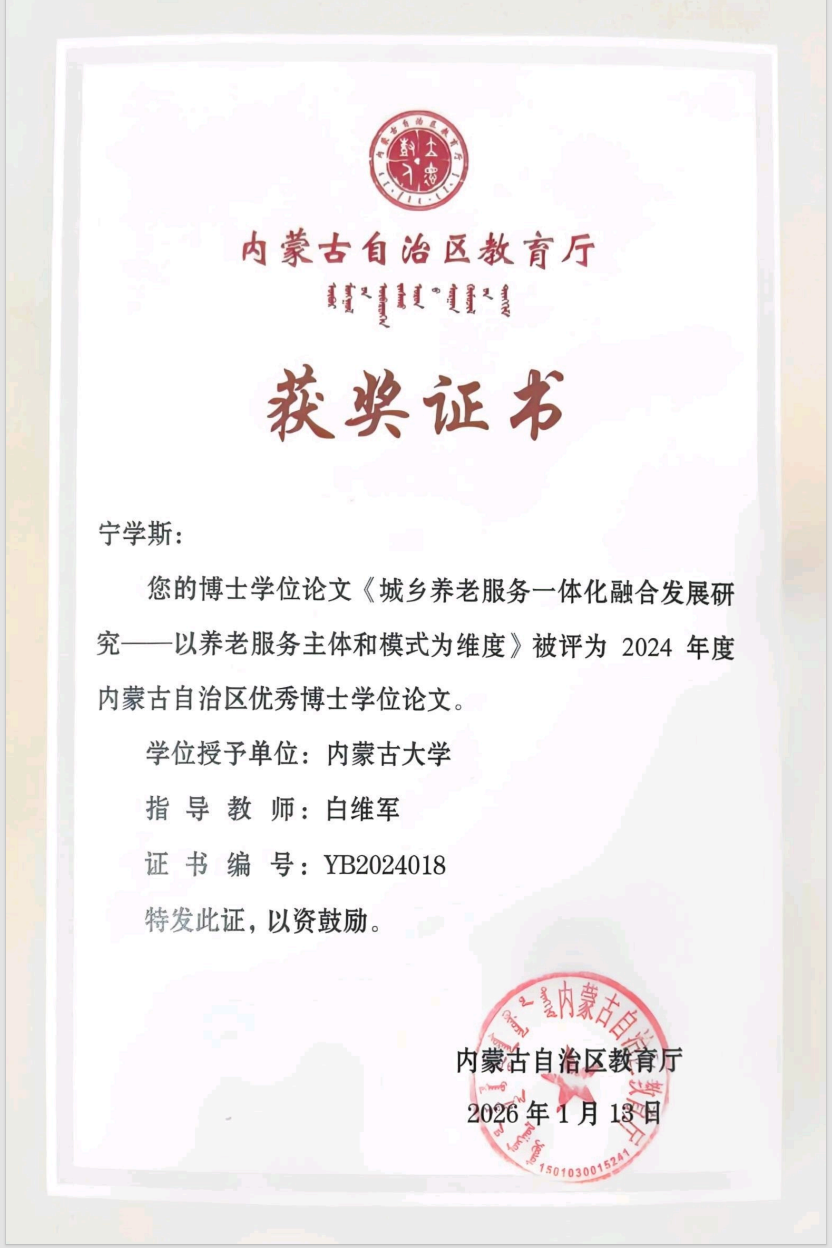 近日,2024年度内蒙古自治区优秀博士和优秀硕士学位论文评选结果正式揭晓,继2023年2篇论文入选后,我院又有2篇论文荣获自治区优秀博士、硕士学位论文。获奖论文分别是:白维军教授指导的博士学位论文《城乡养老服务一体化融合发展研究——以养老服务主体和模式为维度》(学生:2021级宁学斯),获评内蒙古自治区优秀博士学位论文;李沃源副教授指导的硕士学位论文《内蒙古政务营商环境评价及影响因素研究》(学生:2021级马宇清),获评内蒙古自治区优秀硕士学位论文。