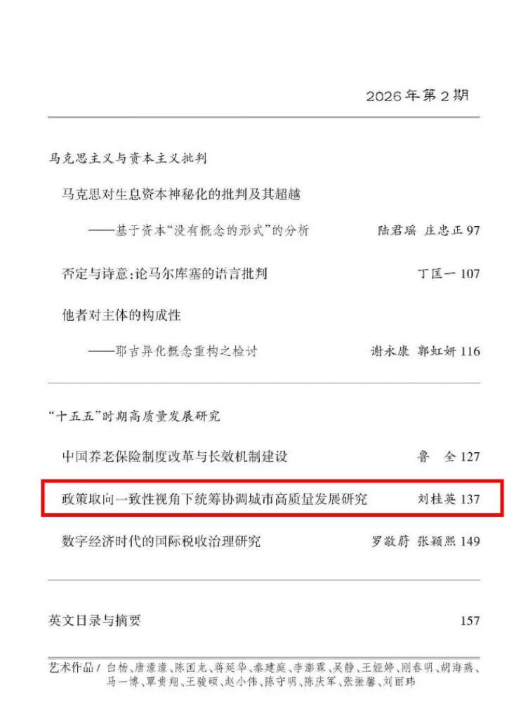日前,我院刘桂英副教授在《中国高校社会科学》2026年第2期发表题为《政策取向一致性视角下统筹协调城市高质量发展研究》的最新研究成果。《中国高校社会科学》是由教育部高等学校社会科学发展研究中心主办的综合性学术期刊,现为CSSCI来源期刊、全国中文核心期刊、AMI综合评价核心期刊。