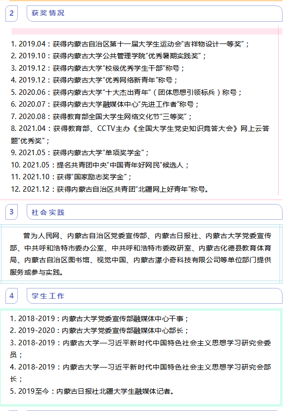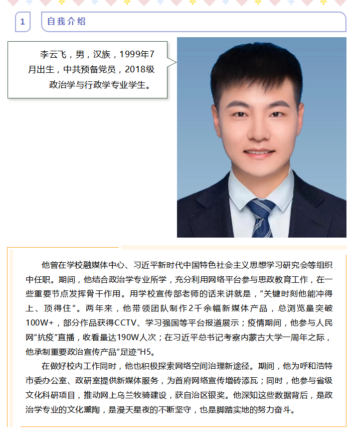 李佳琳,女,tyc5997太阳集团2023届政治学与行政学专业本科生,曾担任班级团支书、本科生党支部副书记、新生班辅导员等学生工作,曾获得乌兰夫奖学金、内蒙古自治区级“三好学生”、求实奖学金、优秀学生干部、优秀团干部等多项荣誉称号。2023年推免至南开大学马克思主义学院攻读硕士研究生学位,担任南开大学校研究生会干事等学生干部、学院研究生会干事、硕士新生班党支书。