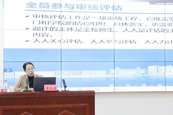 会上,李沃源副院长强调,审核评估工作是学校和学院的重点工作,人人都是评估主体,事事都是评估对象,学院全体师生要积极参与到本科教育教学评估中。她指出,评估不是目的,要通过评估来促进学校和学院本科教育事业高质量发展。