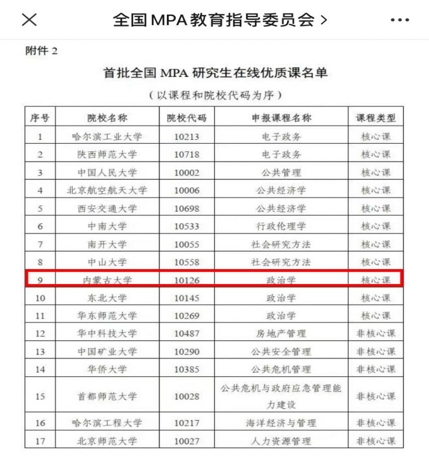 5月8日,全国公共管理专业学位研究生教育指导委员会公布了“首批全国公共管理硕士专业学位研究生在线示范课程”。本次在线示范课程,经过技术检查、院校评选代表评分、教指委工作会评等环节,共评选出“在线示范课程”19门和“在线优质课”17门。我院《政治学》课程从55门候选课程中脱颖而出,成功入选“在线优质课”。