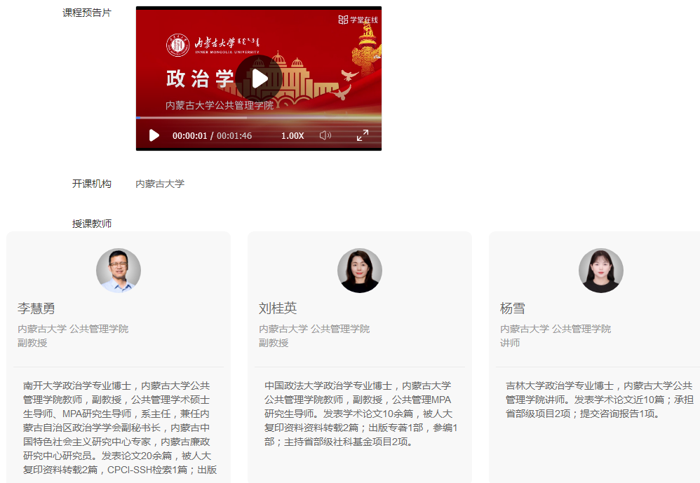 《政治学》在线课程由李慧勇副教授主持,刘桂英副教授、杨雪博士作为主要课程组成员参与。此次在线示范课程建设旨在落实《教育部 国家发展改革委 财政部关于加快新时代研究生教育改革发展的意见》(教研〔2020〕9号)精神,根据《国务院学位委员会办公室关于开展专业学位研究生在线示范课程建设工作的通知》(学位办〔2022〕22号)要求,加强MPA研究生课程建设,加快MPA教育数字化转型,推动优质资源共享,持续建设MPA在线示范课程,统一接入国家高等教育智慧教育平台,用于课程学习、教学参考及学术交流等;通过示范引领,推动各培养单位加大MPA课程建设投入,引导广大MPA教师重视课程教学质量,充分发挥课程教学在MPA研究生培养中的基础性作用。