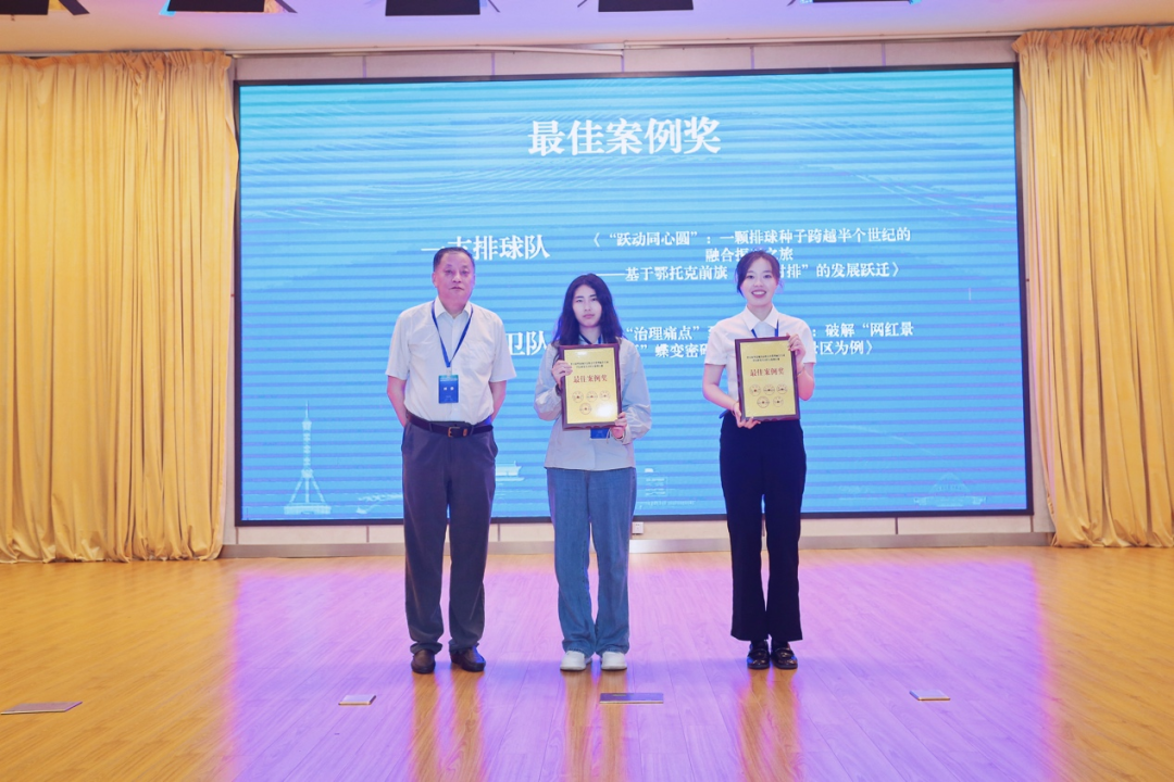韩慧、姜雅婷老师荣获“最佳指导教师”奖,辛妍同学荣获“最有价值队员”奖。“一支排球队”的《“跃动同心圆”:一颗排球种子跨越半个世纪的融合振兴之旅——基于鄂托克前旗“草原村排”的发展跃迁》从60个案例中脱颖而出,获得“最佳案例”奖,实现我院华北地区案例大赛最佳案例“零的突破”。
