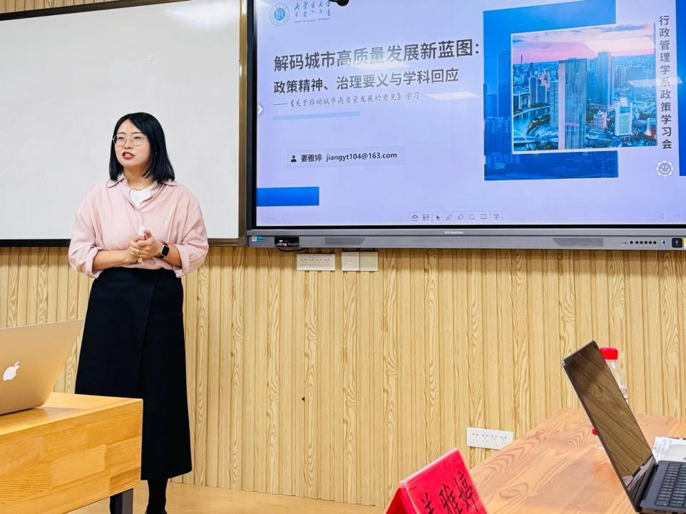2025年10月16日晚,我院行政管理科研团队在玉泉校区卓越楼0308教室开展集体政策学习会,本次学习围绕《中共中央 国务院关于推动城市高质量发展的意见》(以下简称为《意见》)展开,由行政管理科研团队负责人杨腾原副教授主持,行政管理学系近年新进青年教师和硕博士研究生共40多人参加。本次集体政策学习由姜雅婷副教授领学。姜老师围绕《意见》文本和“城市高质量发展”主题,从政策出台概览、核心精神解读、可能的议题三个方...